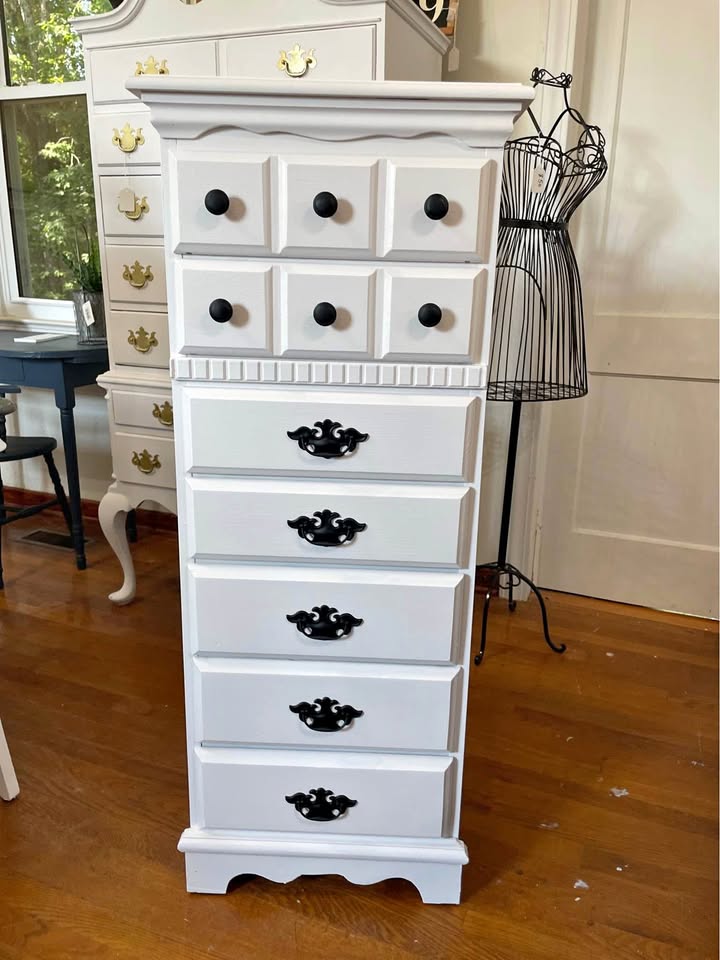 7 drawer lingerie chest by Sears Furniture. Newly refinished in white. Drawers work perfectly. Smoke and pet free home. Dimensions : 19 inches wide, 16 deep, 40 tall. Price includes sales tax. Cash, Venmo or Cash App. View and pick up in Walhalla SC.