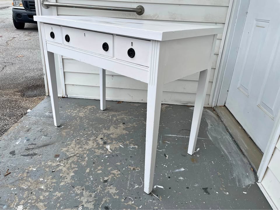 Solid wood vanity newly refinished in white. Drawers work well. Dimensions: 40 inches wide, 20 deep, 31 tall. Stool or chair $40. Price includes sales tax. Cash, Venmo or Cash App. View and pick up by appointment at The Workshop, Walhalla, SC by appointment.